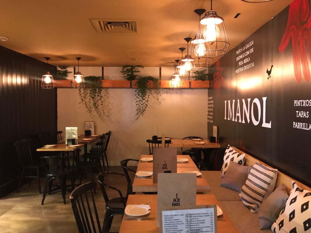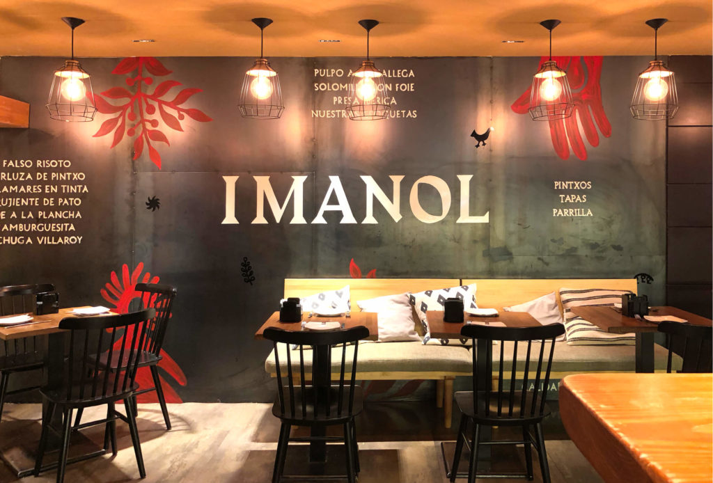 Imanol es un local inspirado en la naturaleza, en la esencia de los materiales. Siguiendo el lema de la marca Imanol “si es de verdad sabe mejor” hemos querido mantener la materia prima como elemento protagonista del espacio, la madera, la piedra natural escafilada o el acero en bruto son nuestro lienzo para recrear este espacio donde el producto, los pintxos, se exhiben y muestran sobre la barra cobrando mayor importancia.
